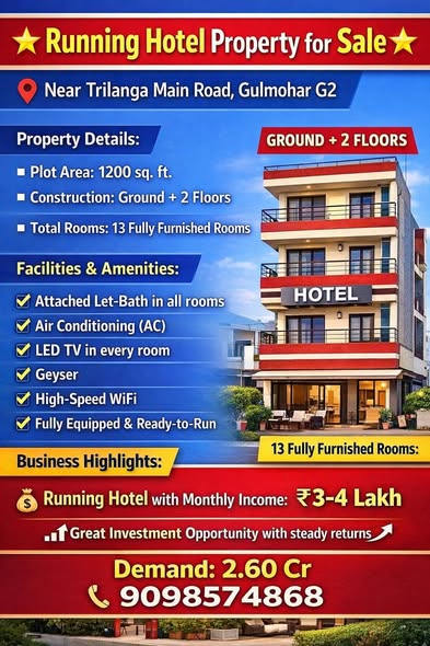 Running Hotel Property for Sale ๐ ๐ ๐ข Property Details: โช Plot Area: 1200 sq. ft. โช Construction: Ground + 2 Floors โช Total Rooms: 13 Fully Furnished Rooms ๐๏ธ Contact 090985 74868